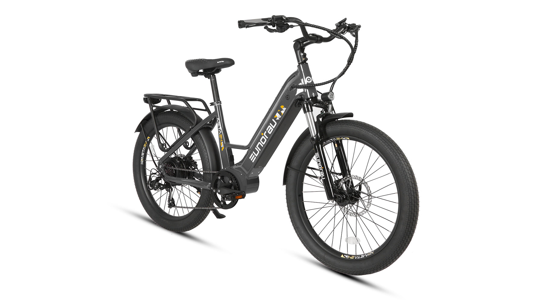 The City Model Meta is your go-to e-bike designed for navigating urban environments with ease. Available with 24" or 26" wheels, it features a powerful 48V 500W hub motor and a torque-sensor pedal assist system. For those longer journeys, an optional second battery is available, ensuring you can travel further without worries. Crafted with a durable 6061 aluminum frame, it comes equipped with hydraulic disc brakes, a Shimano 7-speed drivetrain, LED lights, and fenders to make commuting and running errands hassle-free.